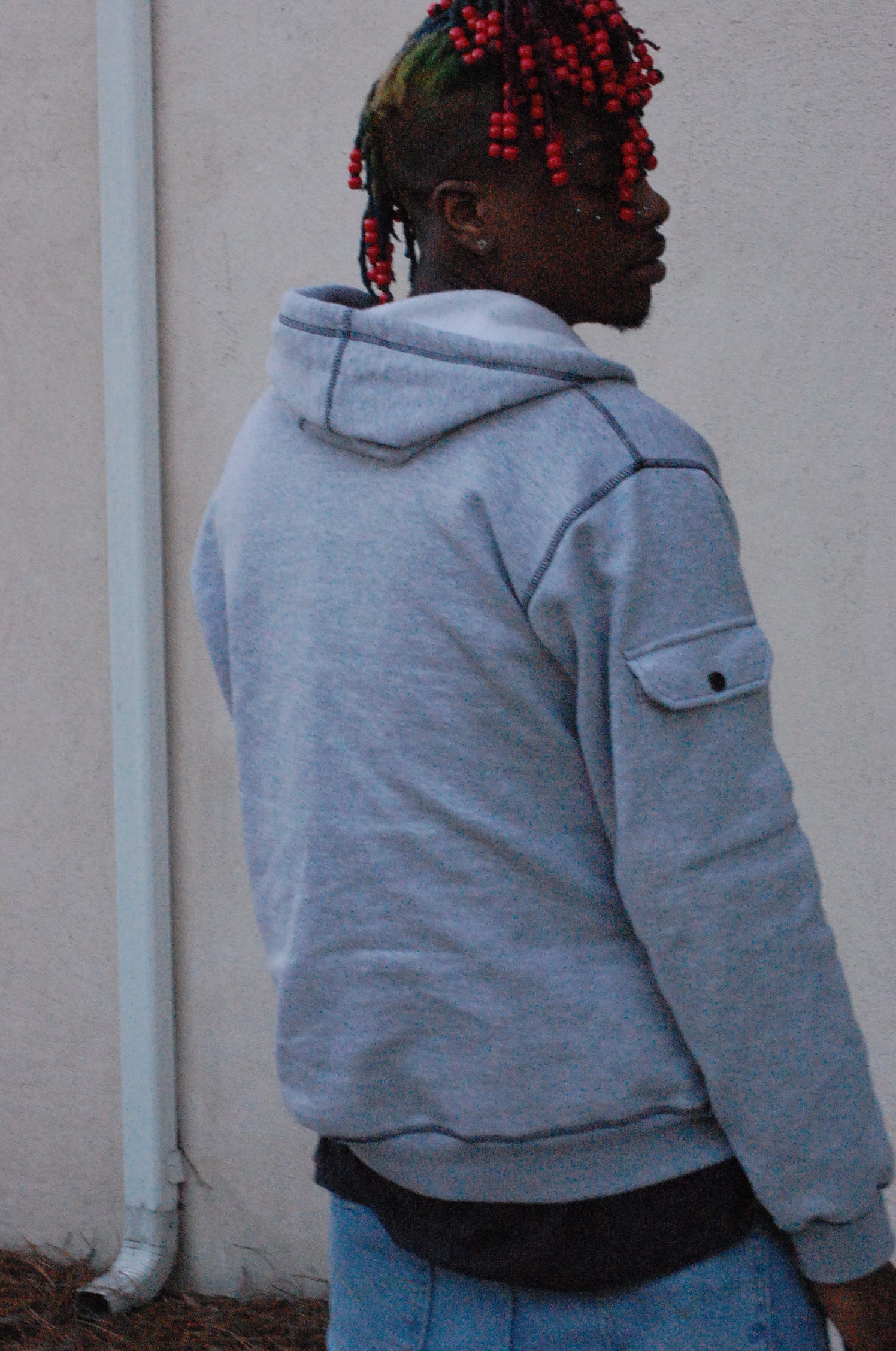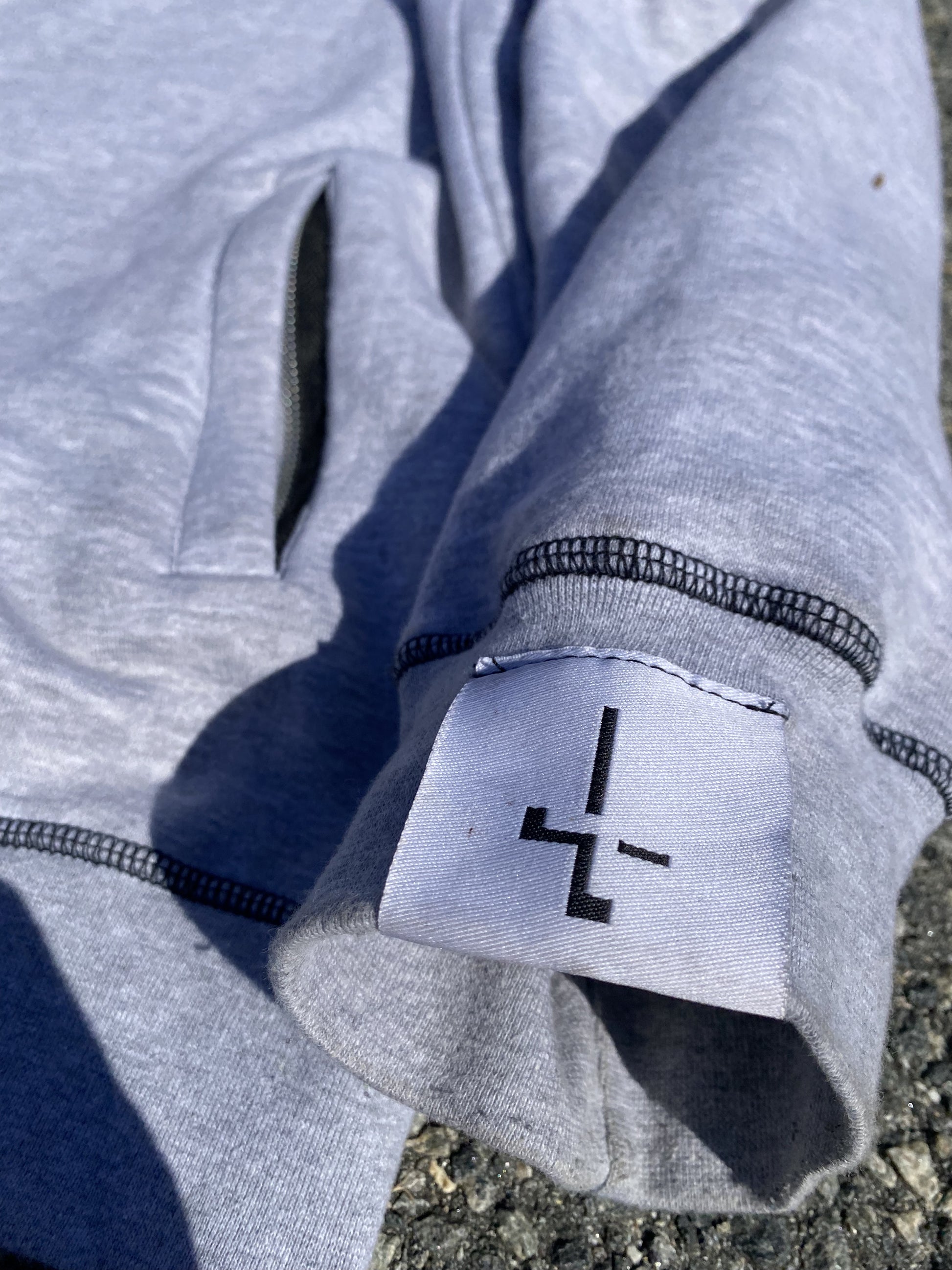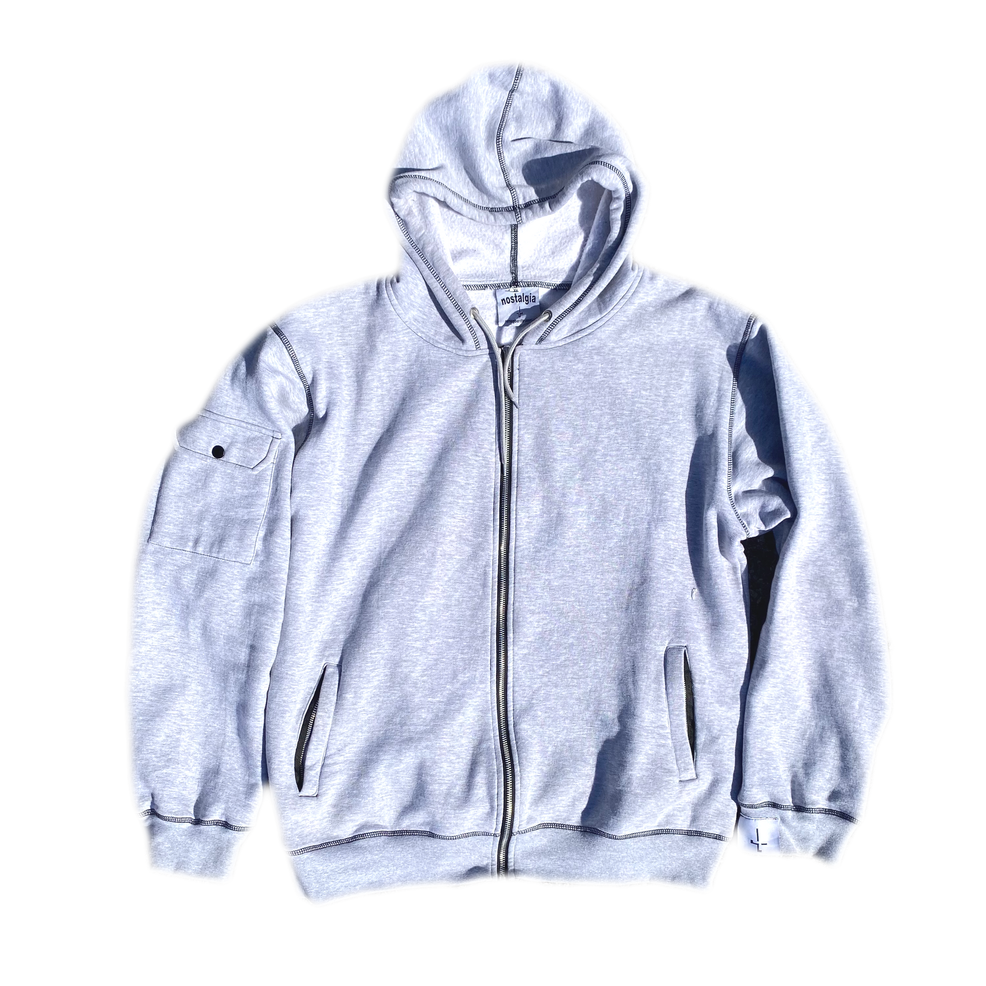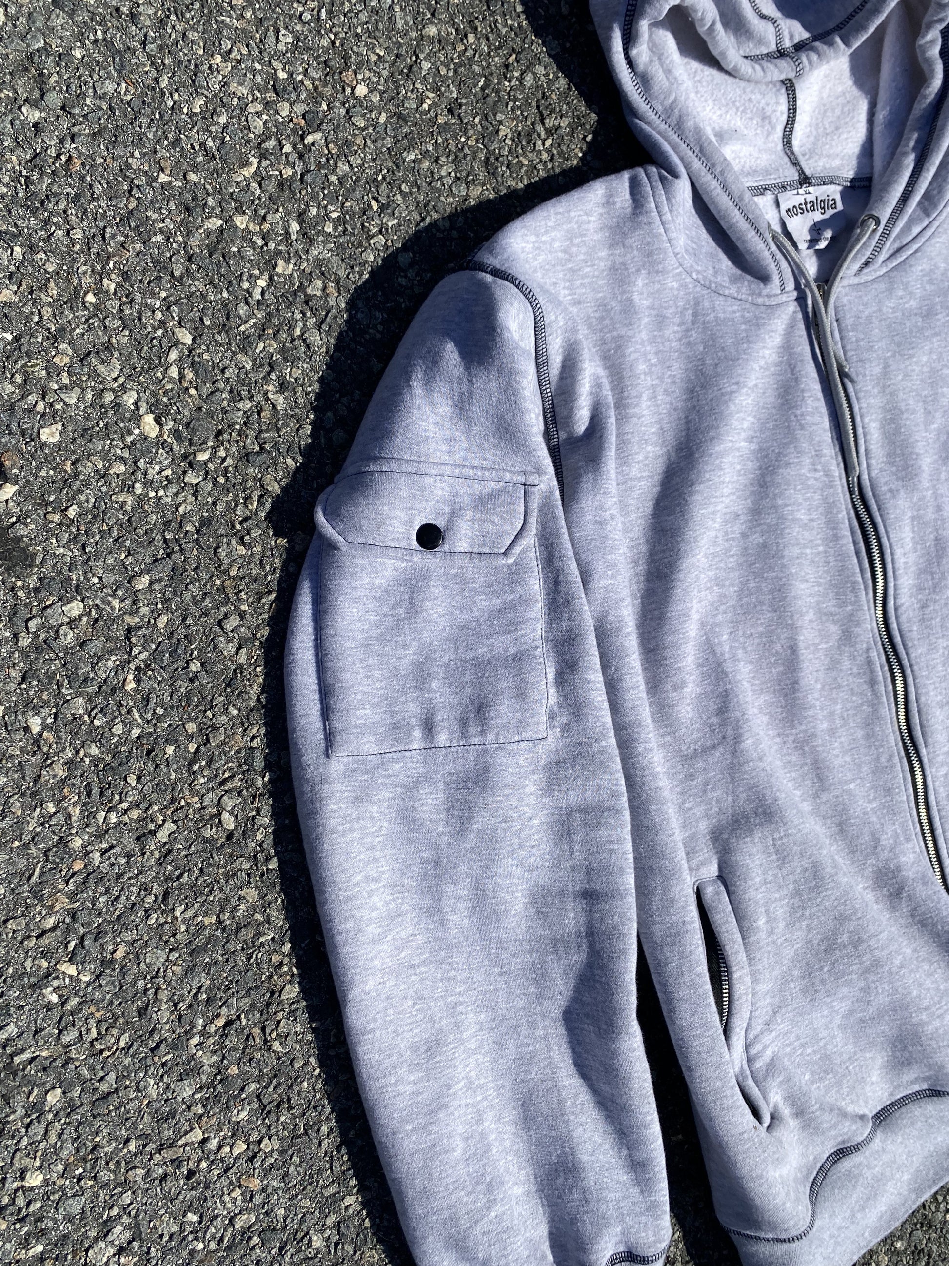 Essential Grey Jacket with reversed NTA wrist tag, arm pocket, and zippers on front facing pockets.