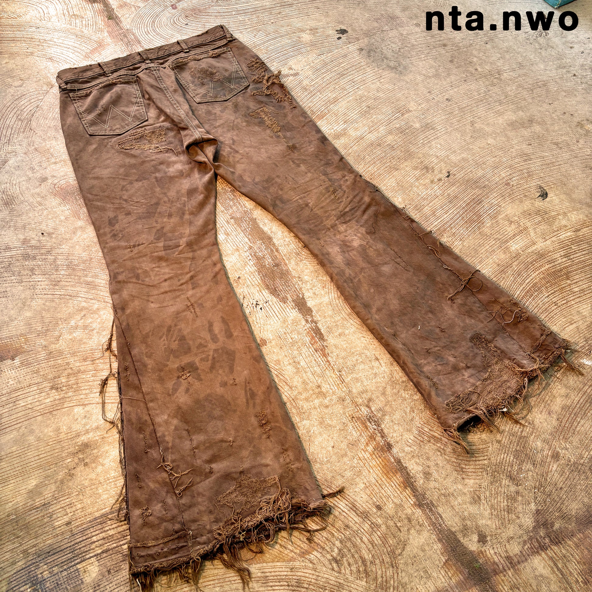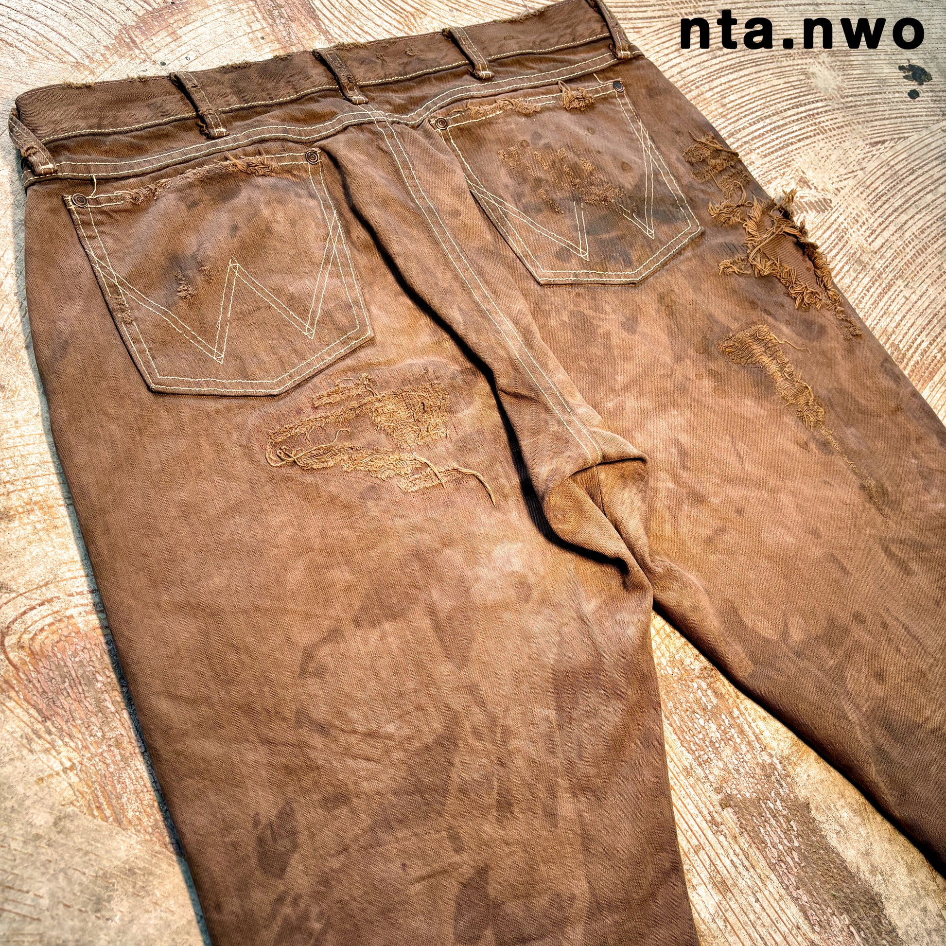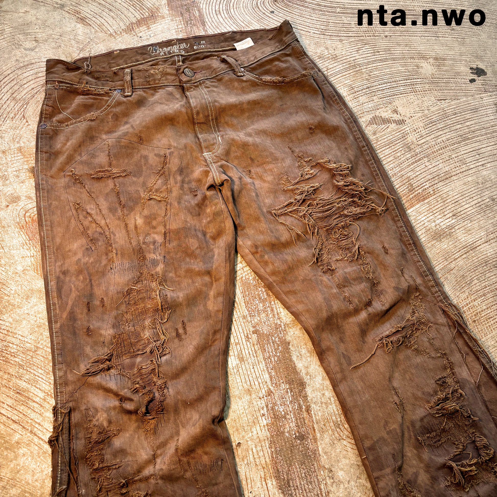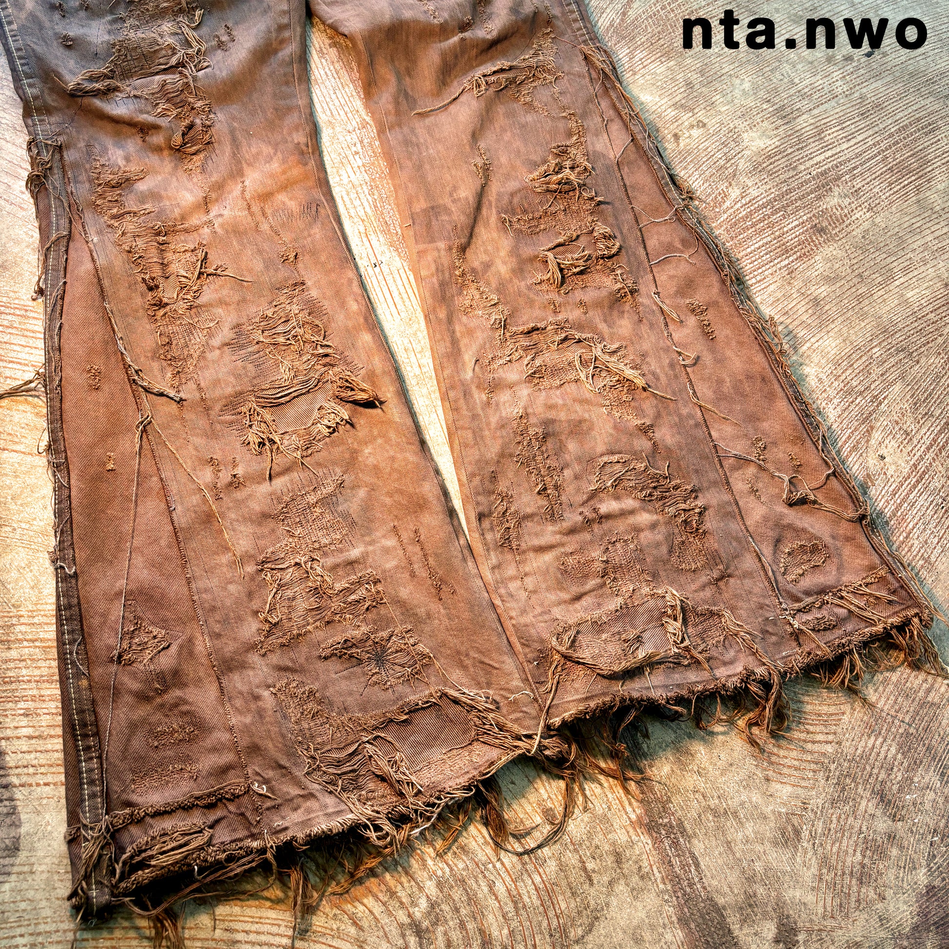distressed all over; darned in some spots; intentionally broken threads some spots